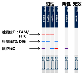 試紙條質(zhì)控線(C線)和其中1條檢測線(T線)出現(xiàn)條帶,其中:T1為紅色,C線為藍色時,說明FAM標記信號分子的相應靶基因可判定為陽性;T2為藍色,C線為紅色時,說明Dig標記分子的相應的靶基因可判定為陽性。