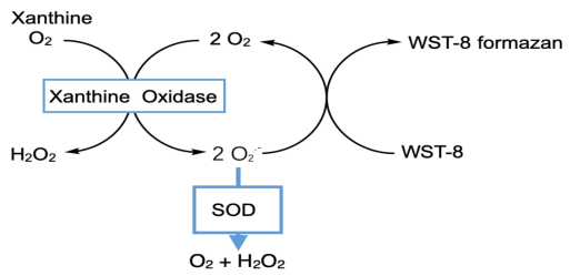 目前測定SOD比較先進(jìn)的方法包括WST-1法和WST-8法,其中WST-8法比WST-1法更加穩(wěn)定、靈敏度更高。本試劑盒采用了目前測定SOD方法中穩(wěn)定性更好、靈敏度更高的WST-8法,可以檢測出低達(dá)0.5U/ml的超氧化物歧化酶。WST-8法的原理參考圖1,WST-8可以和黃嘌呤氧化酶(Xanthine Oxidase, XO)催化產(chǎn)生的超氧化物陰離子(O2.-)反應(yīng)產(chǎn)生水溶性的甲臜染料(formazan dye),由于SOD能催化超氧化物陰離子發(fā)生歧化作用,所以該反應(yīng)步驟可以被SOD所抑制,因此SOD的活性與甲臜染料的生成量成負(fù)相關(guān),從而通過對WST-8產(chǎn)物的比色分析即可計算SOD的酶活力。