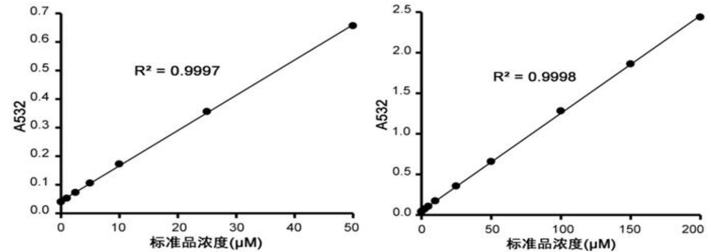c.水浴冷卻至室溫,1000g室溫離心10分鐘。取200微升上清加入到96孔板中,隨后用酶標(biāo)儀在532nm測(cè)定吸光度。如果不方便測(cè)定532nm的吸光度,也可以測(cè)定530-540nm之間的吸光度??梢栽O(shè)定450nm為參考波長(zhǎng)進(jìn)行雙波長(zhǎng)測(cè)定。