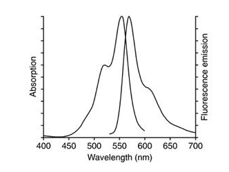DiI即DiIC18(3),全稱為1,1'-dioctadecyl-3,3,3',3'-tetramethylindocarbocyanineperchlorate,是最常用的細(xì)胞膜熒光探針之一,呈現(xiàn)橙紅色熒光。DiI是一種親脂性膜染料,進(jìn)入細(xì)胞膜后可以側(cè)向擴(kuò)散逐漸使整個(gè)細(xì)胞的細(xì)胞膜被染色DiI在進(jìn)入細(xì)胞膜之前熒光非常弱,僅當(dāng)進(jìn)入到細(xì)胞膜后才可以被激發(fā)出很強(qiáng)的熒光。DiI被激發(fā)后可以發(fā)出橙紅色的熒光,DiI和磷酯雙層膜結(jié)合后的激發(fā)光譜和發(fā)射光譜參考下圖1。其中,最大激發(fā)波長為549nm,最大發(fā)射波長為565nm。