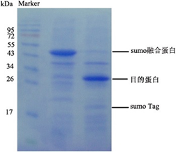 待測(cè)融合蛋白100μg,加入TEV Protease 2μl,4℃反應(yīng)16小時(shí),取酶切前后樣品SDS-PAGE檢測(cè),如右圖所示 >90% 融合蛋白被切割。