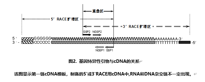 無論是5'-RACE和(或)3'-RACE反應(yīng)都必須要設(shè)計基因特異性引物(gene-specific primers,GSP),分別命名為GSP1和GSP2。各自的巢式PCR基因特異性引物(NGSP1和NGSP2)可用于RACE產(chǎn)物的分析。在某些情況下,這些巢式的引物也可用于RACE PCR反應(yīng)。第Ⅵ節(jié)中會詳述引物設(shè)計的方法。圖2顯示了SUPERSWITCH? RACE反應(yīng)中所使用的引物與其序列來源的相對關(guān)系。