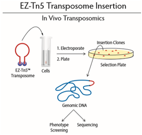 Figure 2. An EZ-Tn5 Transposome Complex can be electroplated into living cells where it randomly insert the transposon insertion site can be host’s genomic DNA. The EZ-Tn5 Transposon insertion site can be analyzed by a variety of methods.