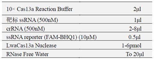 Cas13a核酸酶(又名C2c2)是VI型CRISPR-Cas系統(tǒng)效應(yīng)蛋白,具有RNA介導(dǎo)的RNA內(nèi)切酶活性。在靶標(biāo)單鏈RNA存在PFS序列的情況下,可特異性地切割靶標(biāo)RNA。此外,Cas13a還具有依賴于靶標(biāo)單鏈RNA的反式切割活性(即旁路切割活性),可用于開發(fā)靶標(biāo)核酸的快速檢測試劑盒。