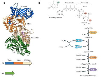 牛痘病毒加帽酶將 7-甲基鳥苷帽結(jié)構(gòu)(m7Gppp,Cap0)加到 RNA 的 5′ 末端。在真核生物中,該結(jié)構(gòu)與 mRNA 的穩(wěn)定、轉(zhuǎn)運(yùn)和翻譯密切相關(guān)。通過酶促反應(yīng)為 RNA 加帽是一種簡(jiǎn)單有效的方法,能顯著改善用于體外轉(zhuǎn)錄、轉(zhuǎn)染和顯微注射的RNA的穩(wěn)定性和翻譯能力。這種酶由兩個(gè)亞基(D1 和 D12)組成 (圖 1a),D1 亞基執(zhí)行 RNA 三磷酸酶和鳥苷轉(zhuǎn)移酶的功能,D12亞基執(zhí)行鳥嘌呤甲基轉(zhuǎn)移酶的功能,它們對(duì)于添加一個(gè)完整的 Cap0 結(jié)構(gòu) m7Gppp5′N 都是必須的(圖 1b)。
