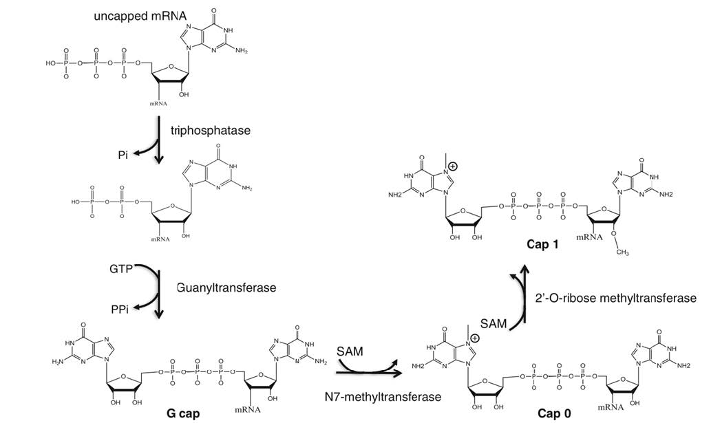 圖1. 參與mRNA 加帽的酶促途徑。Cap 0 結(jié)構(gòu) RNA 的產(chǎn)生需要牛痘病毒加帽酶:該酶兼具三磷酸酶、鳥苷轉(zhuǎn)移酶和鳥嘌呤甲基轉(zhuǎn)移酶的功能。其中S-腺苷甲硫氨酸(SAM)是甲基供體。一旦產(chǎn)生了Cap 0 結(jié)構(gòu),就可以通過2'-O-核糖甲基轉(zhuǎn)移酶進(jìn)一步修飾以產(chǎn)生Cap 1 結(jié)構(gòu)。本圖引自Michael Beverly , Amy Dell, Parul Parmar, Leslie Houghton et al (2016). Label-free analysis of mRNA capping efficiency using RNase H probes and LC-MS. Anal Bioanal Chem.