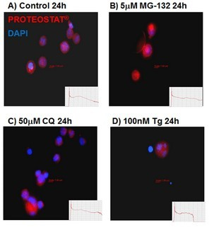 由內(nèi)質(zhì)網(wǎng)應(yīng)激的自噬細(xì)胞產(chǎn)生的聚集小體和聚集小體類的包涵體,epi-熒光顯微成像圖。未經(jīng)處理的K562細(xì)胞(A);加入5 mM MG-132溶液培育24小時(shí)(B);加入50 mM CQ培育24小時(shí)(C);加入100 nM毒胡蘿卜素(D)。在溫室下,用PROTEOSTAT? 染料(1:10,000稀釋)來固定染色細(xì)胞30分鐘。PROTEOSTAT? 的著色顯示 聚集體 和 ALIS呈紅色, DAPI 呈藍(lán)色。(Courtesy of the Flow Cytometry Core Facility, Blizard Institute, Queen Mary University of London, London, UK) |
