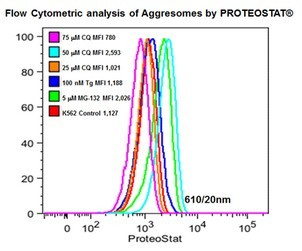 用0.2% DMSO模擬培育Jurkat細(xì)胞或在37℃下用5μM的MG-132過夜培育。然后,用proteostat?染料孵育和固定細(xì)胞,不需清洗然后直接通過流式細(xì)胞儀,在FL3信道使用488nm的激光進(jìn)行分析。在MG-132處理的細(xì)胞時(shí),紅色熒光信號(hào)增加了約3倍。上述的操作會(huì)影響蛋白質(zhì)聚集小體的檢測(cè)。 |