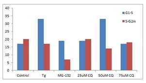 分別25,50,75mmCQ,100nM的毒胡蘿卜素(TG)或5mM的MG-132處理K562細(xì)胞24小時(shí)。然后在溫室下用PROTEOSTAT?染料(1:10,000稀釋)固定并透化培育細(xì)胞30分鐘。接著在BD LSR II的藍(lán)色610/20nm的信道分析細(xì)胞(30,000)。Courtesy of the Flow Cytometry Core Facility, Blizard Institute, Queen Mary University of London, London, UK. |