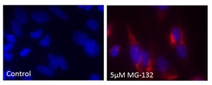 用5μM MG-132培育帶有HeLa細(xì)胞的聚集小體12小時(shí)后(右圖),加入ProteoStat?聚集小體染料(紅色)和用Hoechst33342復(fù)染,然后進(jìn)行觀察。未經(jīng)培育的聚集小體(左圖)。 |