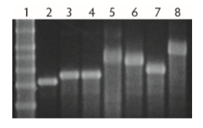 圖1.定制的Poly(A)尾部長度。 使用各種反應(yīng)條件將1.4-kb的轉(zhuǎn)錄本進(jìn)行聚(A)尾部修飾,以證明其對聚(A)尾部長度的影響。 每個泳道包含0.1μg完整的poly(A)尾反應(yīng)產(chǎn)物。