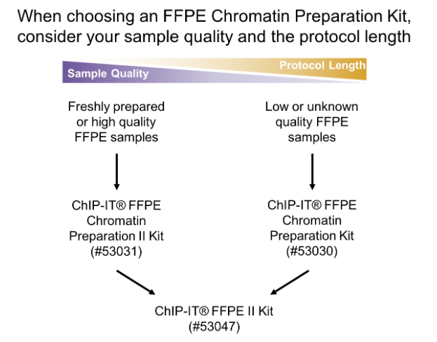 福爾馬林固定石蠟包埋(FFPE)臨床樣本是回顧性研究的寶貴資源。然而,處理FFPE樣本對ChIP等表觀遺傳學(xué)技術(shù)提出了挑戰(zhàn)。Active Motif利用其表觀遺傳學(xué)專業(yè)知識(shí)開發(fā)了市上可用的試劑盒,使FFPE組織的ChIP用于下一代測序(ChIP- seq)。FFPE ChIP檢測有兩個(gè)模塊,染色質(zhì)制備試劑盒(根據(jù)樣品質(zhì)量有兩種選擇)和ChIP- it?FFPE II試劑盒(用于進(jìn)行基于ChIP的富集),以允許根據(jù)起始材料的類型和數(shù)量靈活使用。