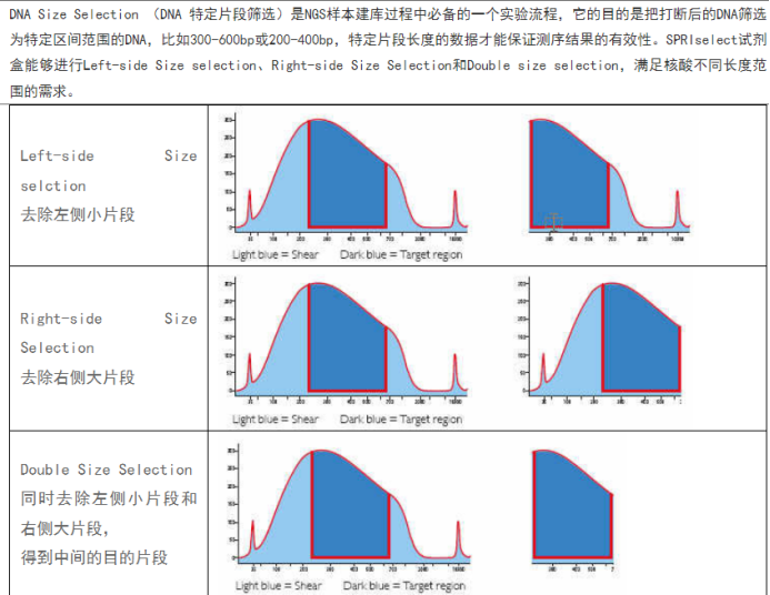 Agencourt SPRIselect是用于NGS(Next Generation Sequencing)核酸特定片段范圍篩選的試劑盒,例如從打斷的gDNA中篩選大小在300-600bp的片段。不僅免去了割膠純化帶來(lái)的不便,還可結(jié)合自動(dòng)化工作站實(shí)現(xiàn)高通量樣本制備。