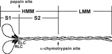 Figure 1. Diagrammatic representation of the myosin II protein and its subfragments. Myosin II or conventional myosin is a hexameric protein consisting of two heavy chains and two light chains. Myosin II can be proteolytically cleaved into heavy meromyosin (HMM, Cat.# MH01) and light meromyosin (LMM) by α-chymotrypsin. Heavy meromyosin consists of the myosin head subfragment-1 domain (S1), its associated light chains (essential light chains and regulatory light chains), and the coiled-coil subfragment -2 domain. Light meromyosin consists of coiledcoil protein structure. The myosin S1-subfragment is produced by papain digestion of HMM.