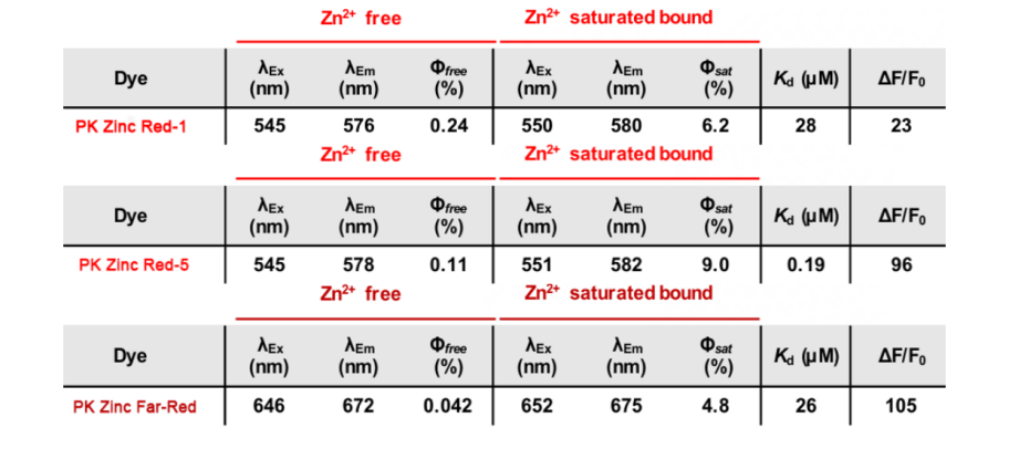 PK Zinc Red-5的親和力最強(qiáng),信噪比也最高,所以檢測信號的效果最好,PK Zinc Red-1和PK Zinc Red-5 本質(zhì)區(qū)別就是親和力。