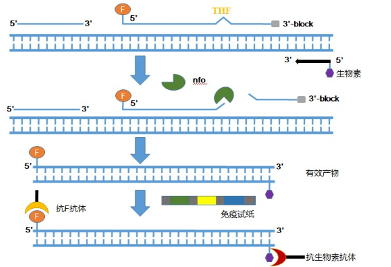 核酸試紙條三明治夾心檢驗法探針設(shè)計:在上下游引物中間設(shè)計一條長度為46-52nt與目的片段互補序列;5’端修飾一個抗原標(biāo)記(典型FAM);5’端和3’端中間位置標(biāo)記一個dSpacer(THF);3’端標(biāo)記一個修飾基團(tuán),如胺基、生物素或C3-Spacer,同時要求下游引物5’端標(biāo)記一個修飾基團(tuán)。