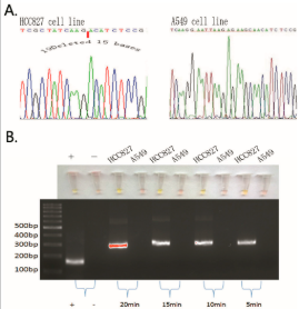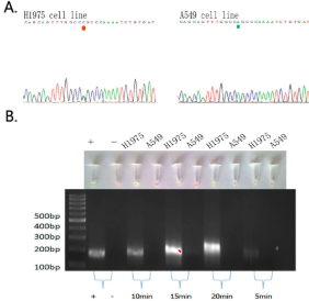 文章中,作者比較了在PCR,測序以及ARSP在非小細(xì)胞肺癌中EGFR突變檢測應(yīng)用,發(fā)現(xiàn)在非小細(xì)胞肺癌細(xì)胞系中,5分鐘便能檢測到EGFR 19Del(2)缺失突變,10分鐘檢測EGFRL SNP 突變,實現(xiàn)肉眼快速判斷(圖1),并在組織樣本中同樣得到驗證(圖2)。