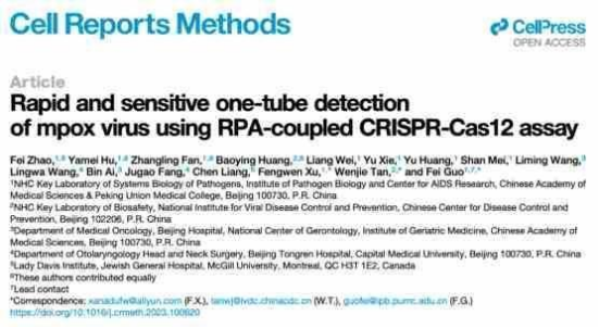 2023年10月16日,中國醫(yī)學科學院病原生物學研究所郭斐課題組在 Cell Reports Methods 期刊發(fā)表了題為:Rapid and sensitive one-tube detection of mpox virus using RPA-coupled CRISPR-Cas12 assay 的研究論文。
