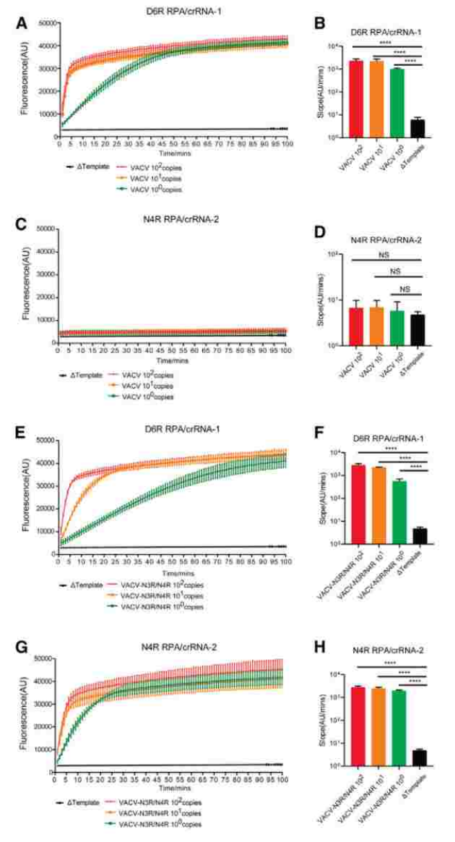 進一步針對選擇的crRNA,分別檢測不同拷貝數的質粒模板以及病毒DNA模板,觀察到CRISPR-Cas12a單獨檢測體系的檢測限約為108拷貝數,不同crRNA的聯合可以將檢測限提高到107拷貝數,同時實現了正痘病毒與猴痘病毒的區(qū)分。并且為了實現最低檢測限,研究團隊團隊將等溫擴增(RPA)與CRISPR-Cas12a的檢測體系聯合,最終能夠達到1個拷貝的最低檢測限,大大提高了檢測體系的靈敏度(圖2)。