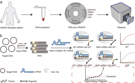 具有致病性線粒體DNA (mtDNA)點(diǎn)突變的患者通常會出現(xiàn)致殘性神經(jīng)系統(tǒng)綜合征,導(dǎo)致嚴(yán)重殘疾和過早死亡[1]。至少有1/5000的人口受到mtDNA疾病的影響[2]。線粒體遺傳疾病的單核苷酸多態(tài)性(SNP)通常存在異質(zhì)性[3],即:野生型和突變型共存。突變異質(zhì)率不同的個(gè)體表現(xiàn)出不一樣的臨床癥狀[1]。同質(zhì)的mtDNA突變可以很容易地在血液中檢測到。然而,對于異質(zhì)突變,突變mtDNA的百分比水平因組織而異,并且在同一個(gè)體中也可能隨時(shí)間而變化(例如,導(dǎo)致Leber遺傳性視神經(jīng)病變(LHON)的m.11778A>G)。因此SNP異質(zhì)率的精確檢測對線粒體遺傳疾病的診斷至關(guān)重要。最近,基于CRISPR的分子診斷技術(shù)因其特異性強(qiáng)、靈敏度高、檢測速度快等優(yōu)點(diǎn)受到廣泛關(guān)注[4, 5]。例如,巢式RPA和CRISPR/Cas12a輔助病毒鑒定的多重分析平臺(MAPnavi)被用于快速(< 40分鐘)診斷多種呼吸道病毒[6]。然而,這些單信號輸出方法難以準(zhǔn)確診斷mtDNA疾病的異質(zhì)性水平,因?yàn)榻Y(jié)果受到樣本中模板總量的影響。與基因組SNP基因分型不同,mtDNA疾病的異質(zhì)性水平診斷需要更準(zhǔn)確的SNP豐度定量,這仍然是一個(gè)挑戰(zhàn)。