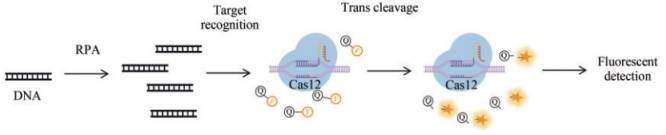 廣泛應(yīng)用于核酸檢測的三種Cas12a蛋白包括LbCas12a、AsCas12a和FnCas12a,其中LbCas12a的反式切割活性最強(qiáng)。2017年Jennifer Doudna團(tuán)隊開發(fā)了DETECTR(DNA endonuclease-targeted CRISPR trans reporter)檢測技術(shù),利用LbCas12a(Lachnospiraceae bacterium ND2006)與crRNA復(fù)合物,并在crRNA引導(dǎo)下利用RuvC結(jié)構(gòu)域切割PAM(TTTN)序列下游18~25nt的靶DNA,在識別并切割靶標(biāo)dsDNA的同時,激發(fā)Cas12a的反式切割活性,切割反應(yīng)體系中的ssDNA報告分子。ssDNA報告分子標(biāo)記有熒光基團(tuán)和猝滅基團(tuán),一旦切割,熒光基團(tuán)和猝滅基團(tuán)被分離,就會產(chǎn)生穩(wěn)定而強(qiáng)烈的熒光信號,熒光信號的強(qiáng)度可以指示檢 測樣本中靶標(biāo)的量。此外,DETECTR還與重組酶聚合酶等溫擴(kuò)增技術(shù)結(jié)合(recombinase polymerase amplification,RPA),不僅提高了檢測分析的靈敏度(amol/L水平),而且避免了對復(fù)雜、昂貴設(shè)備的需求。該技術(shù)現(xiàn)已成功應(yīng)用于人乳頭狀瘤病毒(human papilloma virus,HPV)和SARS-CoV-2的檢測。