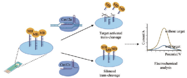 2019年,Dai等開發(fā)了基于CRISPR-Cas12a的E-CRISPR檢測技術(shù),通過CRISPR-Cas系統(tǒng)來影響電信號輸出,利用Cas12a的反式切割活性獲得高傳導(dǎo)信號。該檢測技術(shù)將修飾有3′-亞甲基藍(lán)(3′-MB)標(biāo)簽的ssDNA報告分子固定于金電極上,在靶DNA存在的情況下,Cas12a-crRNA反式切割MB-ssDNA分子,亞甲基藍(lán)標(biāo)簽的分離,會使電化學(xué)信號降低。在沒有靶標(biāo)DNA存在時,Cas12a的反式切割活性保持沉默,ssDNA分子保留在電極表面,從而導(dǎo)致亞甲基藍(lán)的高電化學(xué)電流。