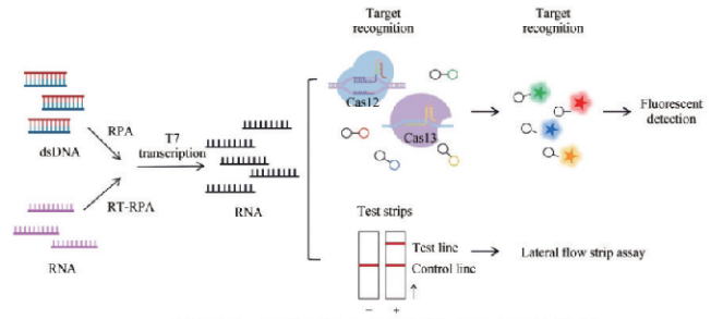 2020年,Ding等開發(fā)了AIOD CRISPR(all-in-one dual CRISPR-Cas12a)檢測技術(shù),將RPA擴(kuò)增和CRISPR檢測的所有反應(yīng)組分混合,在引入兩個crRNA的同時,添加高濃度ssDNA報告分子,一步即可完成對SARS-CoV-2和HIV-1的檢測。