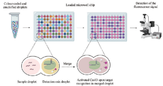 2020年,ACKERMAN等聯(lián)合CRISPR診斷和微流控技術(shù)開發(fā)了CARMEN(combinatorial arrayed reactions for multiplexed evaluation of nucleic acids)檢測平臺,該技術(shù)可以同時檢測8個樣本,169種人類相關(guān)病毒。但由于芯片定制成本高和檢驗操作流程復(fù)制,很難應(yīng)用于臨床。該團(tuán)隊在CARMENv.1的基礎(chǔ)上開發(fā)了mCARMEN(microfluidic combinatorial arrayed reactions for multiplexed evaluation of nucleic acids),將CRISPR診斷、微陣列技術(shù)與簡化的臨床工作流程相結(jié)合,開發(fā)的mCARMEN呼吸道病毒檢測面板,可同時檢測21種呼吸道病毒,包括SARS-CoV-2及其他冠狀病毒、流感病毒等。