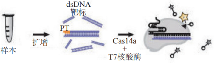 2018年王金、趙國屏團(tuán)隊建立了HOLMES(one-hour lowcost multipurpose highly efficient system)檢測技術(shù),聯(lián)合LbCas12a與PCR擴(kuò)增,可以在1 h內(nèi)完成對偽狂犬病毒(pseudorabies virus,PRV)和日本腦炎病毒(Japanese encephalitis virus,JEV)的檢測,靈敏度可以達(dá)到1~10 amol/L,此外還可以準(zhǔn)確區(qū)分病毒基因型以及人類的單核苷酸多態(tài)性 。但是,該技術(shù)聯(lián)合PCR擴(kuò)增提高穩(wěn)定性的同時也增加了檢測時間和設(shè)備依賴性。