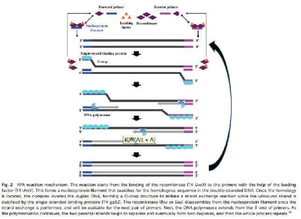 RPA的基本反應(yīng)機(jī)制依賴于對稱為同源重組的自然細(xì)胞過程的綜合工程適應(yīng),這是DNA代謝的關(guān)鍵過程。標(biāo)準(zhǔn)的RPA反應(yīng)試劑包括三個(gè)關(guān)鍵蛋白(重組酶、重組酶裝載因子和單鏈結(jié)合蛋白),隨后與輔助成分如脫氧核糖核酸(DNA)聚合酶、擁擠劑、能量/燃料成分(如三磷酸腺苷、ATP)和鹽分子協(xié)調(diào),執(zhí)行RPA反應(yīng)機(jī)制(圖2)詳細(xì)的反應(yīng)組分及其典型濃度和作用