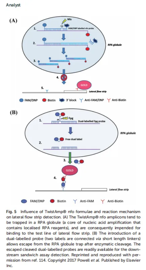與橫向流動(dòng)條帶檢測一樣,可以直接使用RPA擴(kuò)增子,但建議在運(yùn)行條帶之前用運(yùn)行緩沖液(例如1/100稀釋)稀釋擴(kuò)增子,以(1)提高其吸濕性能114和(2)避免“鬼帶”效應(yīng)。45,54,115 - 117值得注意的是,Powell及其同事指出,通過替換高分子量PEG (5.5% 35 kDa;114 .另見2.1節(jié)),在RPA試劑配方中使用低分子量PEG (6.5% 3 kDa)。此外,Powell及其同事還開發(fā)了一種方法,以減輕橫向流動(dòng)條帶檢測的稀釋步驟。他們發(fā)現(xiàn),有時(shí)RPA擴(kuò)增子在“RPA微球”中不可用(核酸擴(kuò)增的核心包含局部的RPA試劑圖5A)。其形成與PEG高度相關(guān),用于結(jié)合到側(cè)流條測試線上。然而,使用雙標(biāo)記探針(兩個(gè)標(biāo)簽通過短長度連接物連接)可以在酶切后從“RPA球”中逃逸,允許擴(kuò)增子準(zhǔn)備好進(jìn)行下游三明治檢測(圖5B)114。