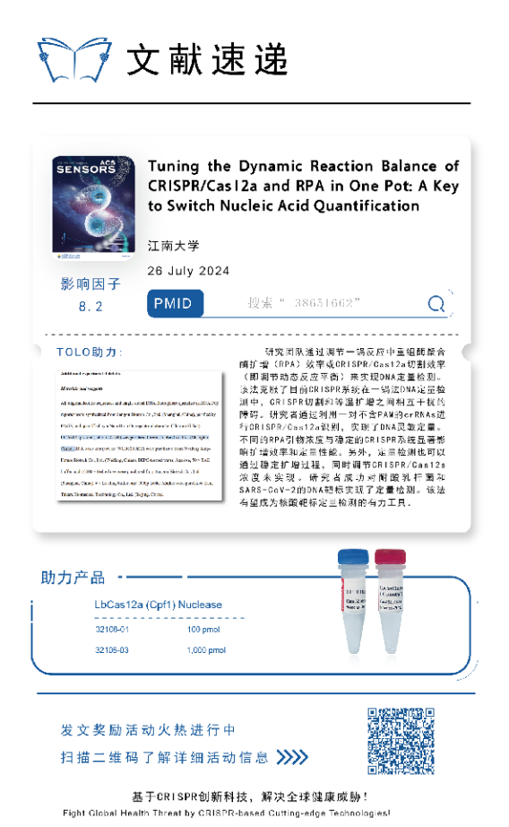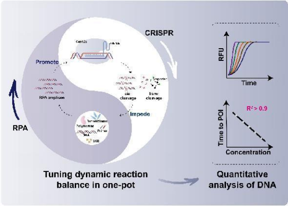 近期,江南大學(xué)生物工程學(xué)院徐巖教授團(tuán)隊(duì)吳群教授課題組在新型微生物定量檢測(cè)技術(shù)的開發(fā)中取得了重要進(jìn)展,研究成果“Tuning the Dynamic Reaction Balance of CRISPR/Cas12a and RPA in One Pot: A Key to Switch Nucleic Acid Quantification”以主封面文章形式正式發(fā)表于《ACS Sensors》雜志(IF:8.9)(https://doi.org/10.1021/acssensors.3c02485)。