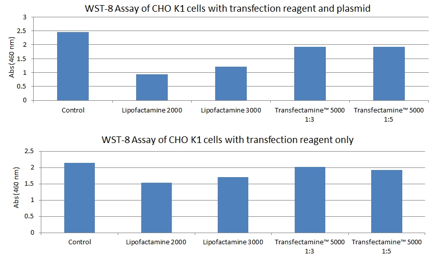 CHO-K1細(xì)胞中的細(xì)胞活力比較。使用Lipofactamine 2000,Lipofactamine 3000和Transfectamine 5000用GFP質(zhì)粒轉(zhuǎn)染一組CHO K1細(xì)胞,用與第一組相同的轉(zhuǎn)染試劑處理第二組CHO K1細(xì)胞,但不使用質(zhì)粒。48小時(shí)后,使用Cell Meter?比色WST-8細(xì)胞定量試劑盒(Cat.22770)測量每組的細(xì)胞活力。460nm處的吸光度越高,表示細(xì)胞越活。
