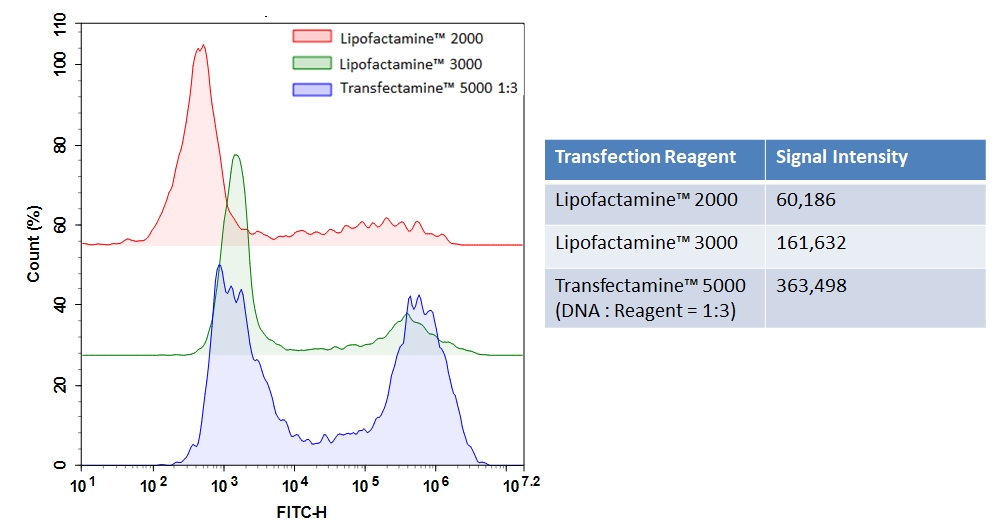 HeLa細(xì)胞中的轉(zhuǎn)染效率比較。將HeLa細(xì)胞在6孔板中培養(yǎng)至90%融合。將2.5 μg GFP質(zhì)粒分別用Lipofactamine 2000,Lipofactamin 3000和Transfectamine 5000轉(zhuǎn)染。通過流式細(xì)胞儀測量信號強(qiáng)度。
