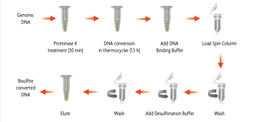 使用Bisulfite Conversion Kit,將目的DNA用蛋白酶K處理,加入重亞硫酸鹽轉(zhuǎn)化試劑和DNA變性劑,在溫度循環(huán)儀中進(jìn)行快速熱變性。經(jīng)過(guò)1.5小時(shí)的DNA轉(zhuǎn)化反應(yīng),樣品加入到試劑盒里的DNA純化柱,脫鹽后洗脫DNA,可用于PCR或其他的下游實(shí)驗(yàn)。