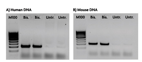 使用Bisulfite Conversion Kit處理人(A)和小鼠(B)基因組DNA,處理(Bis)和未處理(Untr)的DNA分別用陽(yáng)性對(duì)照轉(zhuǎn)化特異性PCR引物進(jìn)行PCR擴(kuò)增分析。陽(yáng)性對(duì)照PCR引物專門適用于經(jīng)重亞硫酸鹽轉(zhuǎn)化的DNA,因此會(huì)擴(kuò)增出220bp的條帶,而未處理的DNA沒(méi)有擴(kuò)增出相應(yīng)條帶。