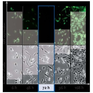 轉(zhuǎn)基因HeLa-GFP細(xì)胞GFP表達(dá)序列的研究? SI+和siRNA直接作用于GFP的mRNA。清晰可見的是GFP表達(dá)在72小時內(nèi)下降到最大值。