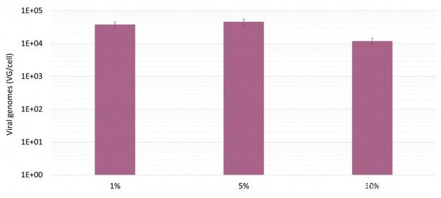通常,轉染復合體積占最終細胞培養(yǎng)體積的10%,這在擴大生產(chǎn)規(guī)模時可能會導致技術限制。FectoVIR-AAV經(jīng)過優(yōu)化,可將絡合量降低至1%,從而有助于制備用于大規(guī)模生產(chǎn)的轉染復合物。例如,對于200 L的細胞懸液體積,轉染復合體積可以從20 L (10%)降至2 L (1%)進行優(yōu)化。