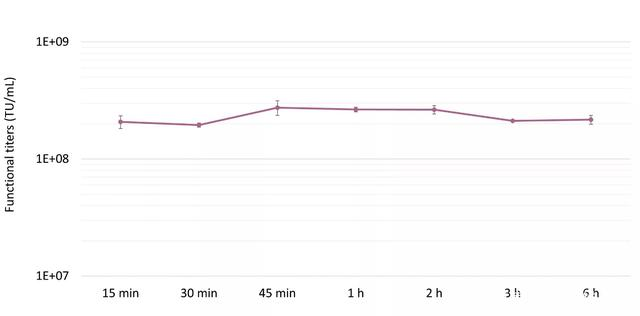 大規(guī)模瞬時轉染需要向懸浮細胞培養(yǎng)物中添加更大體積的轉染復合物,這意味著更長的轉移時間。使用FectoVIR-AAV,轉移時間不再是可以導致病毒滴度產(chǎn)量變化的限制因素。FectoVIR-AAV轉染復合物顯示出極大的穩(wěn)定性:將FectoVIR-AAV轉染試劑和質粒DNA混合后,可以在6h內可靠地將轉染復合物添加到細胞中,而rAAV滴度產(chǎn)量沒有明顯變化。