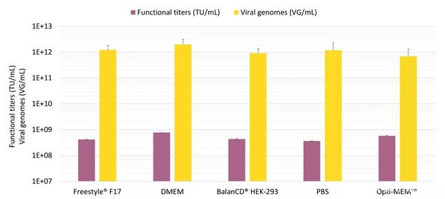 合成細胞培養(yǎng)基的選擇特定于每個rAAV制造平臺。FectoVIR-AAV/DNA復合物的效率已在不同的市售合成復合介質中進行了全面測試,并且效價收率在各種測試介質中的變化很小。