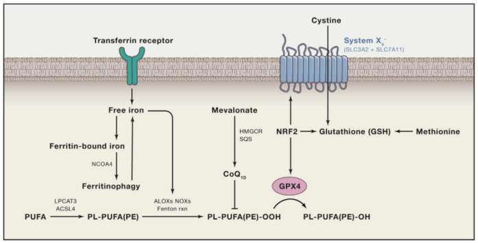 對(duì)鐵死亡的調(diào)控,主要集中在System Xc-、GSH代謝,調(diào)控谷胱甘肽過氧化物酶4(GPX4)活性和ROS生成等方面。