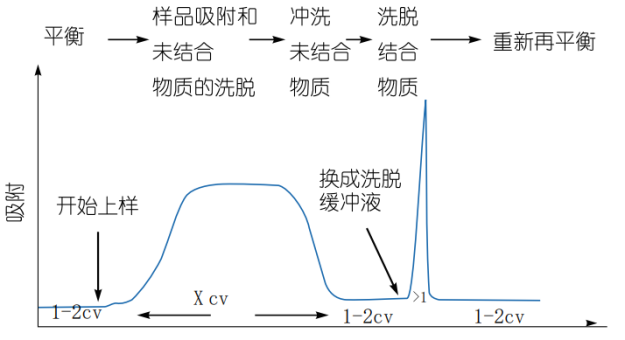用結(jié)合緩沖液洗滌至少10-15個(gè)柱體積,直到吸收峰達(dá)到穩(wěn)定基線或在流出物中沒有物質(zhì)流出。洗滌過程中建議保持流速為1-2ml/min(1ml 體積柱子)。