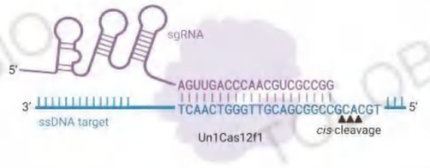 · Cas12f核酸酶是依賴sgRNA介導(dǎo)的內(nèi)切核酸酶,傾向于特異結(jié)合并剪切靶標(biāo)ssDNA,且無需PAM位點