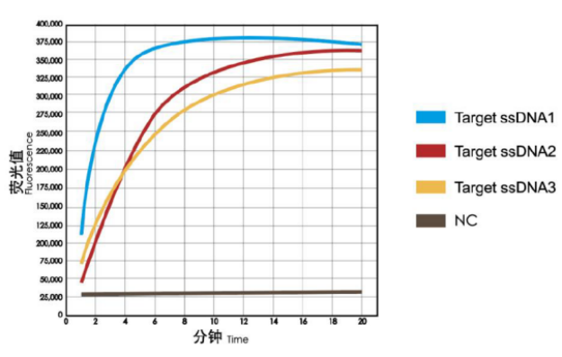· 靶標(biāo)RNA濃度越高,體系反式剪切ssRNA報告探針的速度更快,釋放熒光信號到達平臺期的時間越短