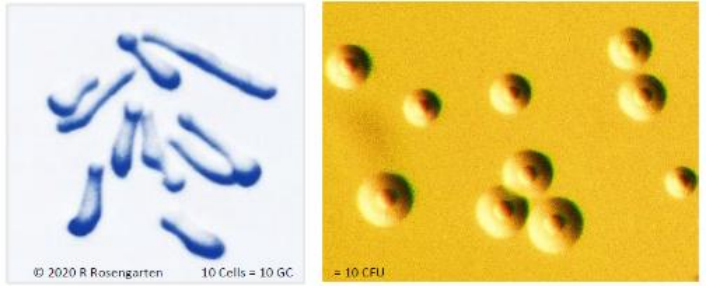 對(duì)數(shù)中期支原體細(xì)胞的每個(gè)細(xì)胞(左)對(duì)應(yīng)1 GC和1 CFU(右)