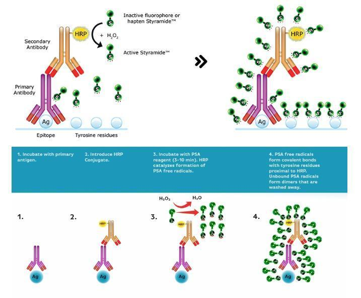 酪胺信號(hào)放大(TSA)是一種基于辣根過(guò)氧化酶(HRP)的催化活性對(duì)靶蛋白或核酸進(jìn)行高密度原位標(biāo)記的酶學(xué)檢測(cè)方法。原理為酪胺Tyramide的過(guò)氧化物酶反應(yīng)(已標(biāo)記熒光的酪胺在HRP催化H2O2下形成共價(jià)鍵結(jié)合位點(diǎn))產(chǎn)生的大量酶促產(chǎn)物與目標(biāo)蛋白的酪氨酸殘基共價(jià)結(jié)合,從而使目標(biāo)蛋白標(biāo)記上特異的熒光或生物素。