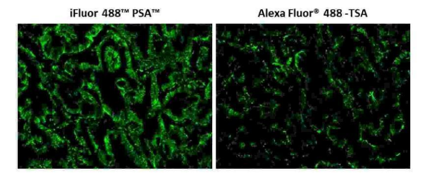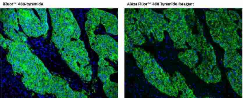 圖2.分別用iFluor 488 PSA和Alexa Fluor 488 TSA染色甲醛固定的石蠟包埋人肺腺癌陽(yáng)性組織的染色結(jié)果圖。人肺腺癌陽(yáng)性組織切片用兔抗EpCam抗體染色,然后用polyHRP標(biāo)記的山羊抗兔IgG二抗孵育,后使用iFluor 488 PSA (Cat#45020)和Alexa Fluor 488 TSA分別染色。圖像顯示iFluor 488 PSA與Alexa Fluor 488 TSA相比提高了熒光IHC的靈敏度。