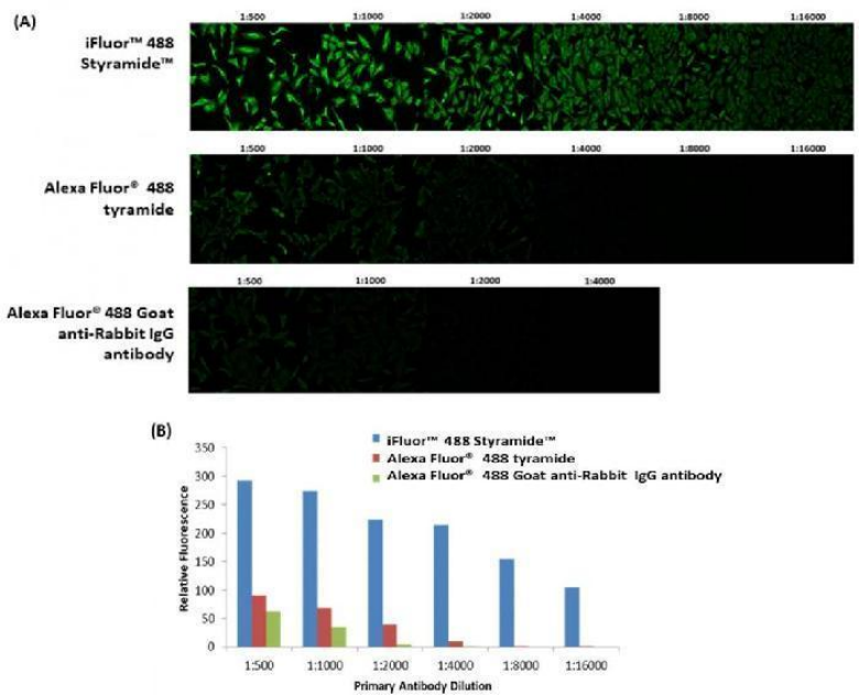 圖4.Styramide 超級(jí)信號(hào)放大試劑盒的信號(hào)強(qiáng)度對(duì)比。 (A)將HeLa細(xì)胞固定,透化并用各種濃度的兔抗微管蛋白一抗標(biāo)記,建議的稀釋濃度為:1:500。 然后將細(xì)胞直接與AlexaFluor488綴合的山羊抗兔IgG二抗染色,后分別與HRP標(biāo)記的山羊抗兔IgG二抗、AlexaFluor 488酪胺和iFluor 488 Styramide(#45205)染色。 使用FITC濾光片組拍攝熒光圖像,并以相同的曝光時(shí)間進(jìn)行分析。 (B)測(cè)量相對(duì)熒光信號(hào)強(qiáng)度,并比較不同檢測(cè)方法之間的強(qiáng)度。