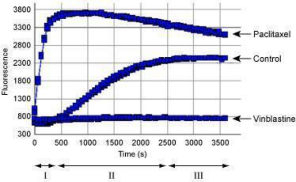 圖1. 使用基于熒光分析法的微管蛋白聚合檢測試劑盒(BK011P)進(jìn)行。Tubulin分別與Paclitaxel和Vinblastine反應(yīng),且設(shè)置另一個單獨(dú)孵育Tubulin作為對照組。每個條件都進(jìn)行了重復(fù)的測試。聚合反應(yīng)在360 nm下激發(fā),420 nm發(fā)射。實(shí)驗(yàn)結(jié)果表現(xiàn)為聚合曲線,該曲線將聚合過程分為3個階段:成核期,生長期,和穩(wěn)態(tài)期。