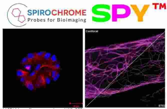 Spirochrome的活細(xì)胞染色探針可通過細(xì)胞膜的物質(zhì),并可以對微管蛋白進(jìn)行染色。與SiR和SiR700染料相比,SPY?具有亮度更高、細(xì)胞毒性更低的特點(diǎn),無需基因操作或過表達(dá)即可對微管進(jìn)行染色